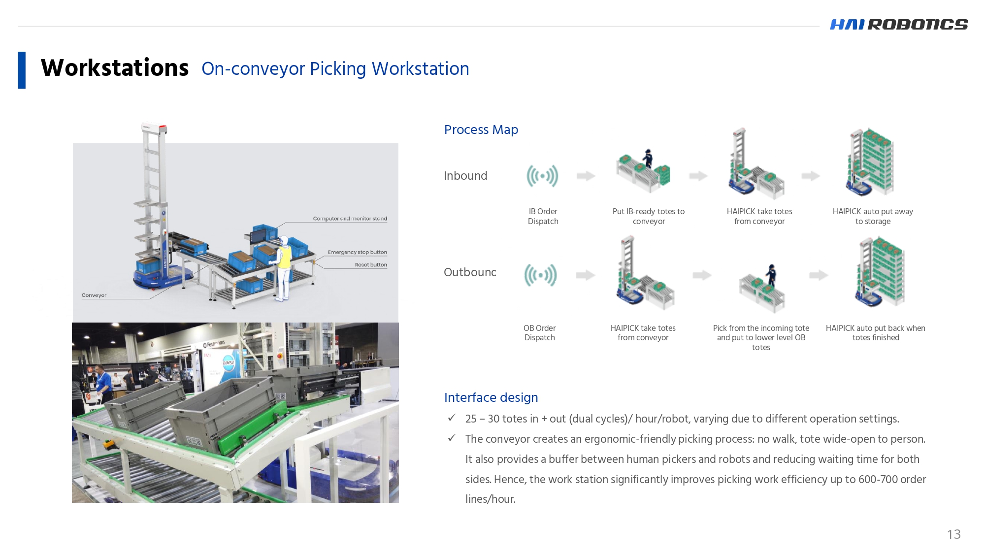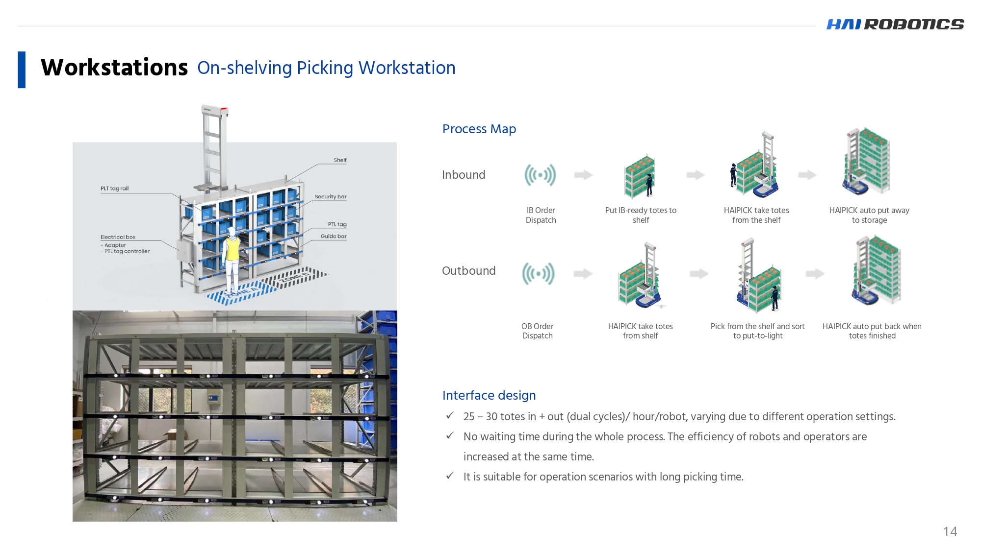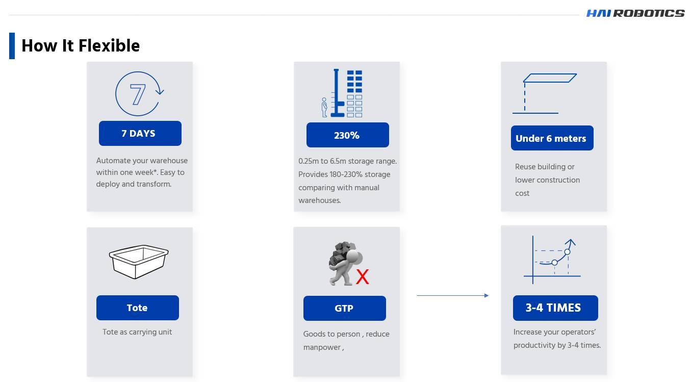 HAI ROBOTICS ประสบความสำเร็จในการคิดค้นระบบ HAIPICK ACR เครื่องแรกในปี 2558 และเป็นผู้บุกเบิกในการนำไปใช้ในเชิงพาณิชย์ที่สมบูรณ์ HAIPICK ได้รับการอัปเกรดเป็นรุ่นที่ 4 เปลี่ยนการทำงานของคลังสินค้าด้วยการขนส่งการเรียกค้นการจัดเก็บและการจัดเรียงอัตโนมัติ HAIPICK System สามารถปรับแต่งได้หลากหลาย ให้เหมาะกับสภาพแวดล้อมต่างๆ