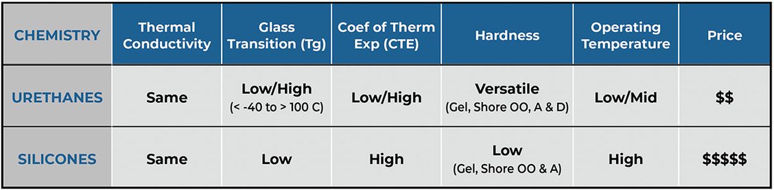 While silicone potting has some advantages, polyurethanes work better in many applications. The main advantage of silicone compounds is their resistance to degradation at temperatures over 200°C, while offering a soft polymer. However, polyurethane’s thermal range can easily handle the operating temperatures of many industrial electronics, and its lower cost raw materials and application processes makes it a better option for a wider range of applications.