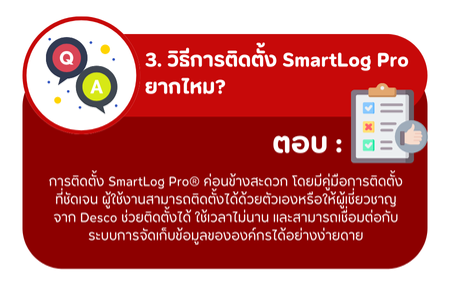 ตอบ: การติดตั้ง SmartLog Pro® ทำได้ง่ายและสะดวก โดยมีคู่มือการติดตั้งที่ชัดเจน ผู้ใช้งานสามารถติดตั้งได้เอง หรือขอความช่วยเหลือจากผู้เชี่ยวชาญของ Desco ใช้เวลาไม่นานและสามารถเชื่อมต่อกับระบบการจัดเก็บข้อมูลขององค์กรได้ทันที