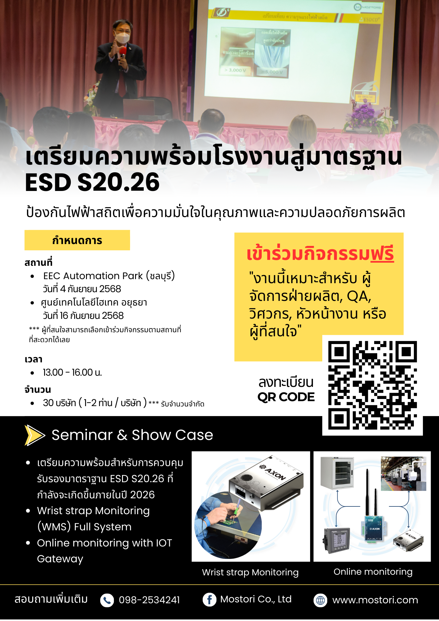 #ESDS20.26 #โรงงานปลอดภัย #ชลบุรี #อยุธยา #ESD #ESDS2026 #ESDProtection #ESDTraining #FactoryStandard #QualityControl #ESDWorkshop #DryCabinet #WMSFull #IoTMonitoring #IndustrialAutomation #EEC #AutomationPark #สัมมนาฟรี #อบรมฟรี #เรียนออนไลน์ฟรี #งานสัมมนา #มาตรฐานโรงงาน #ชลบุรี #อยุธยา #Mostori #ElectronicsManufacturing #SmartFactory