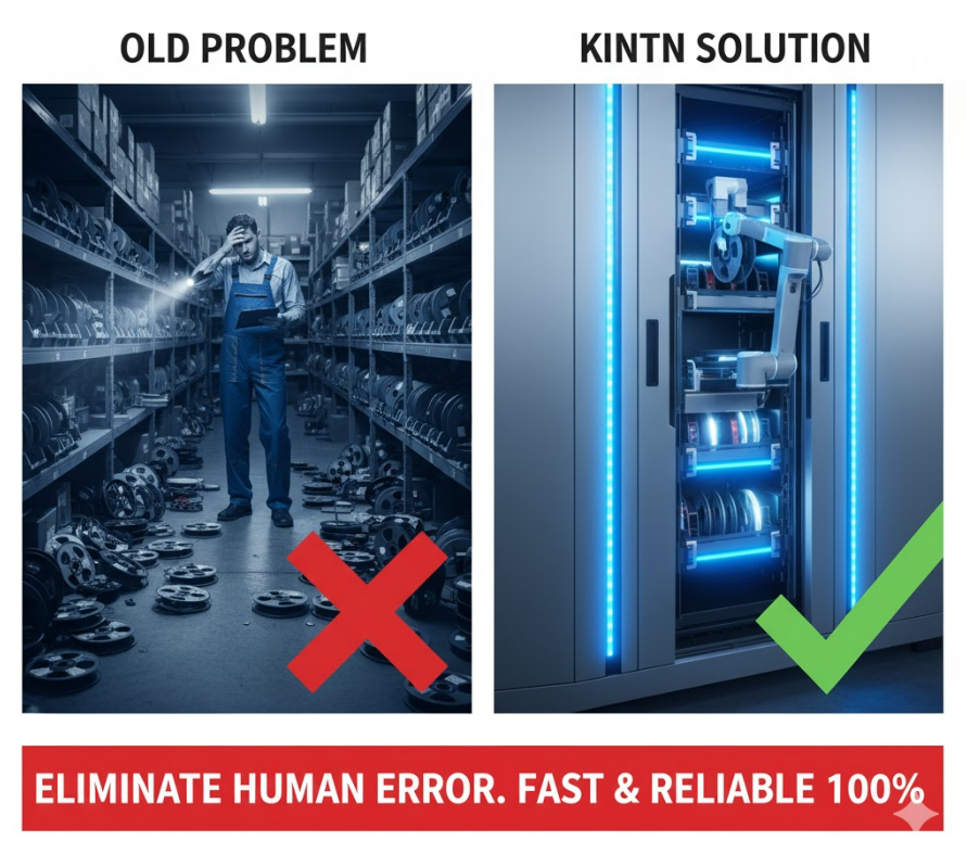 จากเดิมที่ใช้เวลาหลายนาทีในการค้นหา KINTN สามารถค้นหาและส่ง Reel ที่ถูกต้องมาให้คุณได้ภายในไม่กี่วินาที นี่คือ ตู้เก็บอัตโนมัติในสายการผลิต ที่แท้จริง