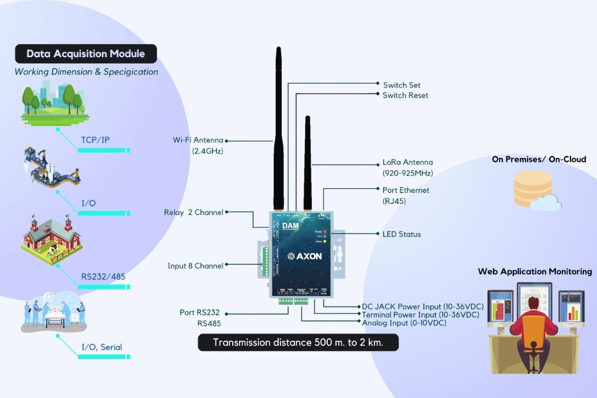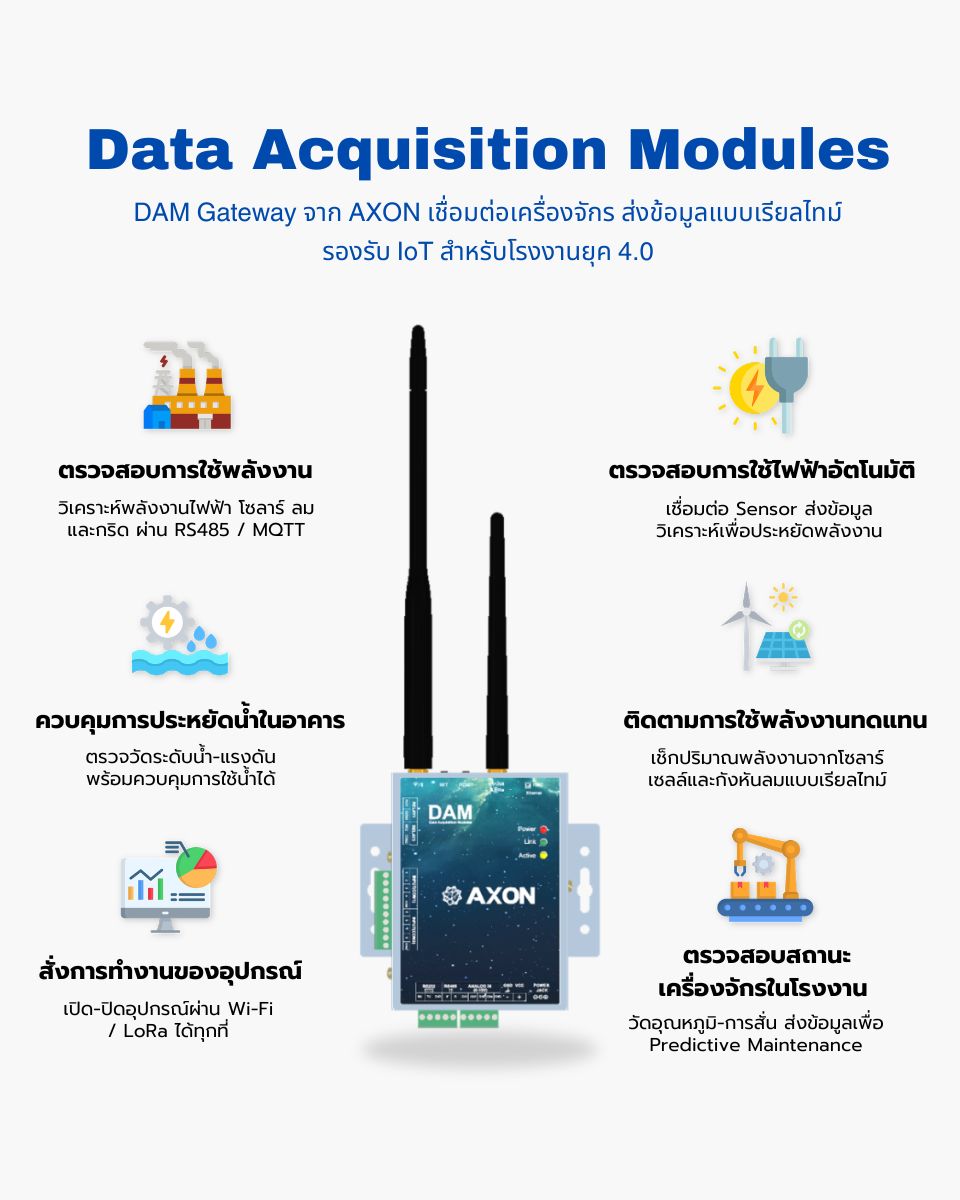 DAM Gateway (Data Acquisition Module) คือคำตอบของการรวมข้อมูลทุก Sensor และทุกเครื่องจักรไว้ในจุดเดียว พร้อมเชื่อมต่อขึ้นระบบ Web Application Monitoring / Cloud / On-Premise ได้อย่างง่ายดาย