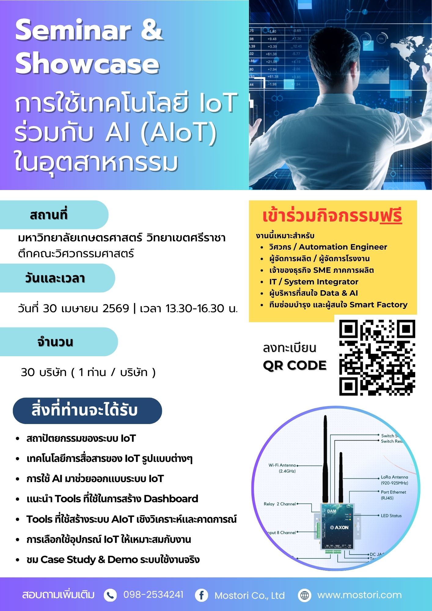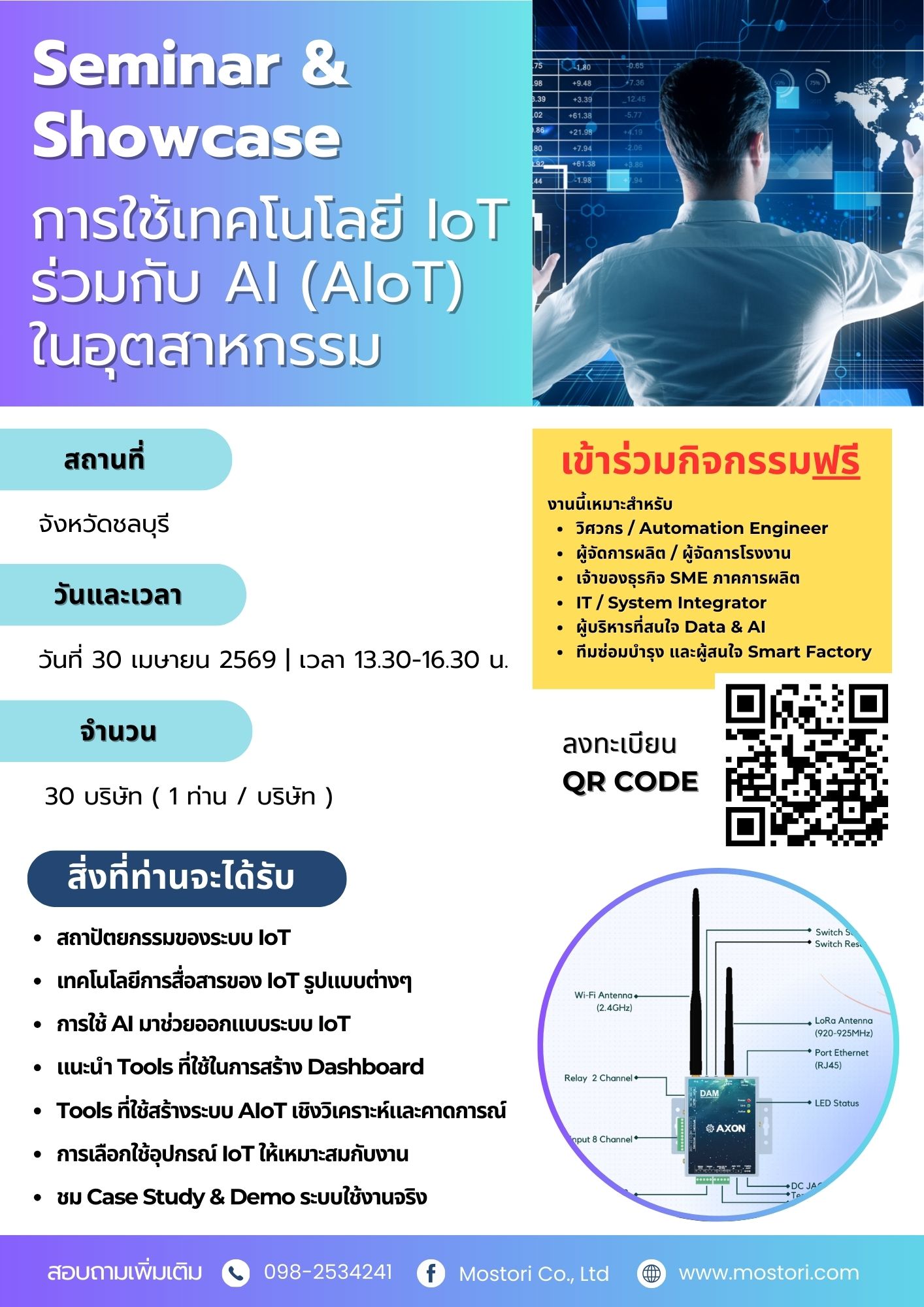 ขอเชิญร่วมงานสัมมนาฟรีเรื่อง "การใช้เทคโนโลยี IoT ร่วมกับ AI (AIoT) ในอุตสาหกรรม" วันที่ 30 เมษายน 2569 ที่ จังหวัดชลบุรี | รับเพียง 30 บริษัท ลงทะเบียนด่วน!