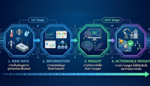 จาก IoT สู่ AIoT ในอุตสาหกรรม ในช่วงแรกของการพัฒนาเทคโนโลยี IoT ในโรงงานอุตสาหกรรม จะเน้นไปที่การเชื่อมต่ออุปกรณ์และการเก็บข้อมูลจากเครื่องจักร เช่น อุณหภูมิ พลังงาน หรือสถานะการทำงานของเครื่องจักร