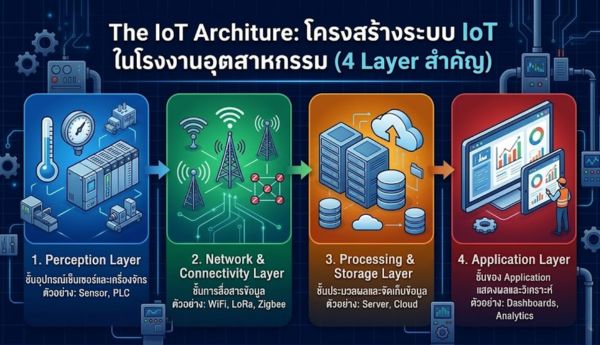 โครงสร้างของระบบ IoT ในโรงงานอุตสาหกรรม ระบบ IoT ในโรงงานโดยทั่วไปประกอบด้วย 4 Layer สำคัญ